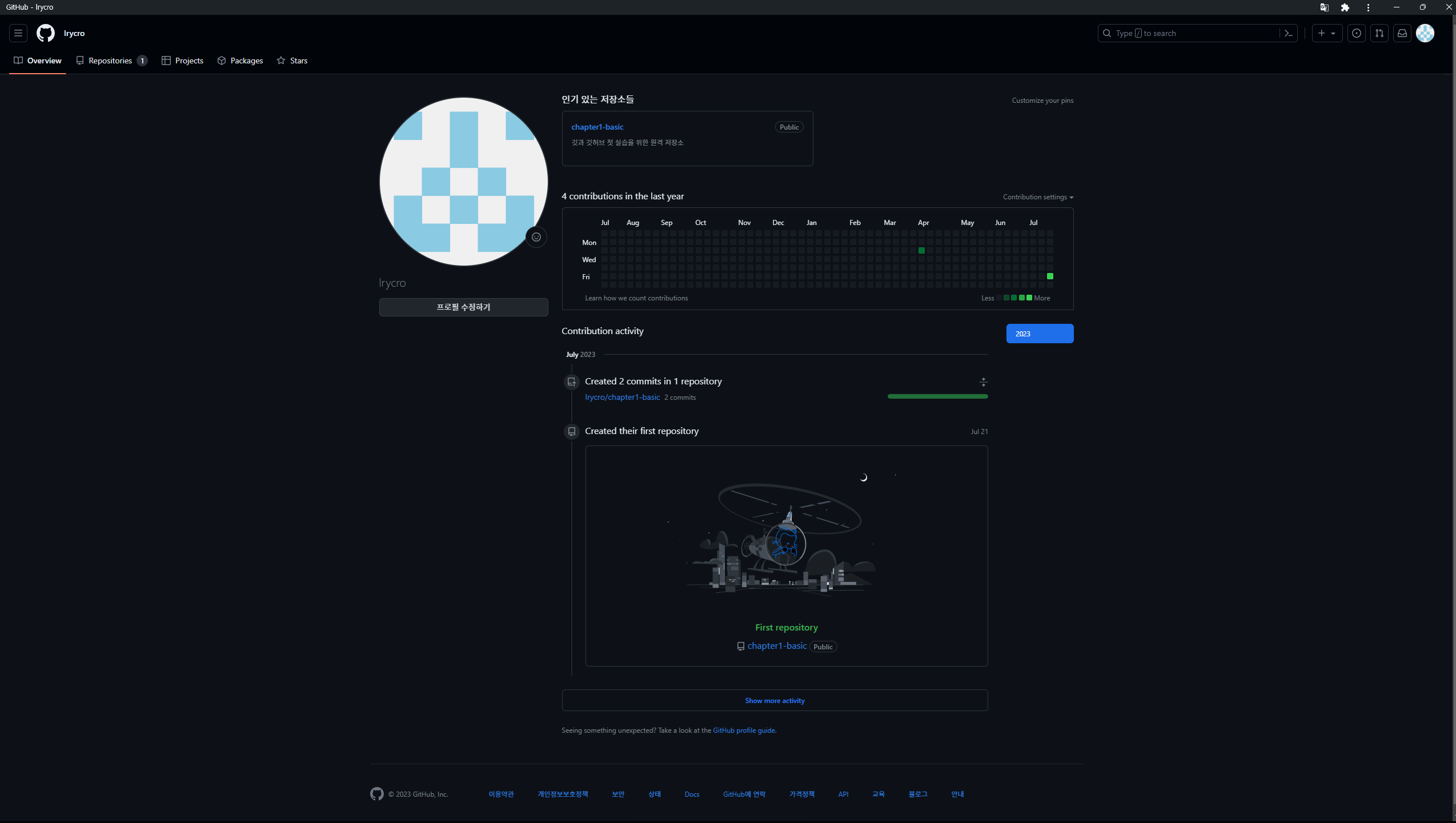 ์ด๋ฒ ํ์ต์ ํตํด ๋ด๊ฐ ์์ฑํ ์๊ฒฉ ์ ์ฅ์ ํ์ด์ง์ ์ปค๋ฐ ๊ฒฐ๊ณผ๋ lrycro's GitHub Repository chapter1-basic๋ฅผ ํตํด ํ์ธํ ์ ์๋ค.