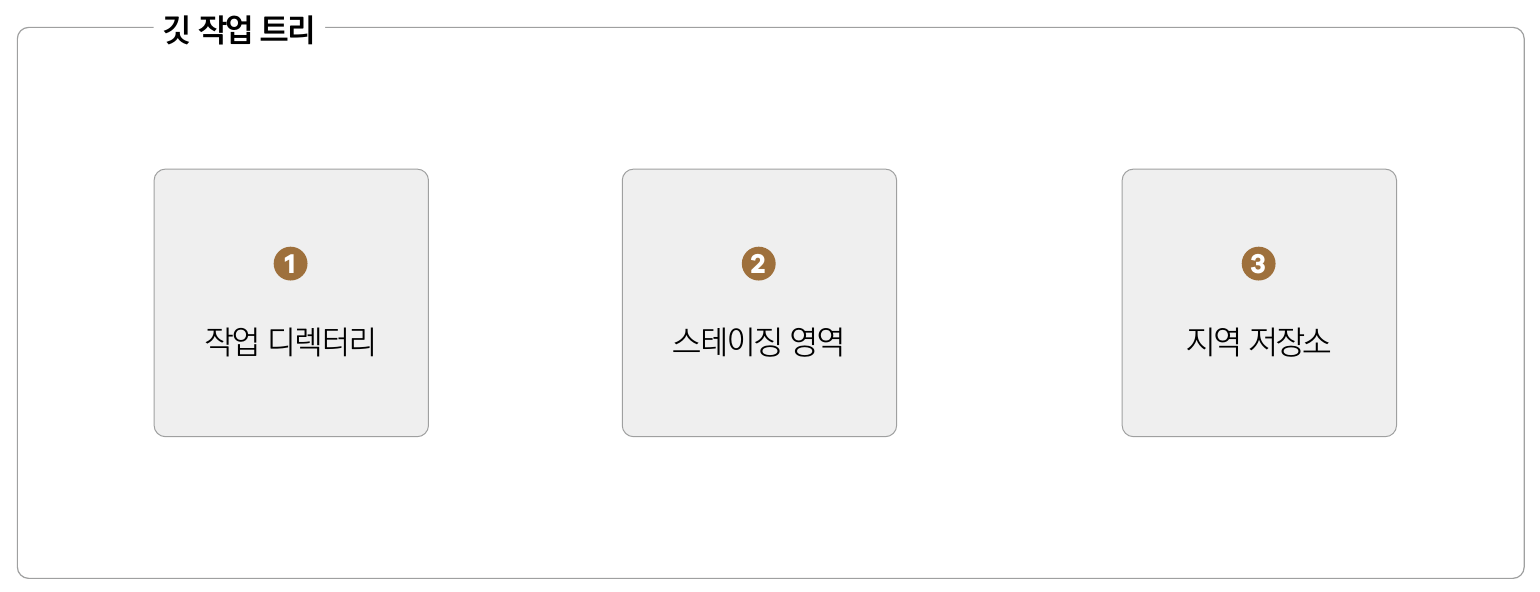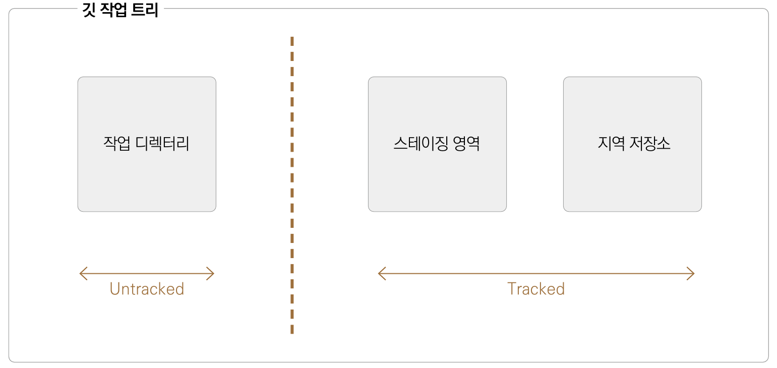 ๊น์ ๊ด๋ฆฌํ๋ ํ๋ก์ ํธ์ ์์ ์ ํจ์จ์ ์ผ๋ก ์ฒ๋ฆฌํ๋ ์์ ํธ๋ฆฌ๋ผ๋ ๊ฐ๋ ์ ์ฌ์ฉํ๋ค. ์์ ํธ๋ฆฌ๋ ๊น์ด ์ถ์ (๊ด๋ฆฌ)ํ๋ ํ์ผ๊ณผ ์ถ์ ํ์ง ์๋ ํ์ผ์ ๊ตฌ๋ถํ๊ณ , ์ถ์ ํ๋ ํ์ผ๋ค์ ์ํ๋ฅผ ๊ตฌ๋ถ ์ง๋ ์์ญ์ด๋ผ๊ณ ์๊ฐํ๋ฉด ๋๋ค. ๊น ์์ ํธ๋ฆฌ ๋ด์ฉ๋ค์ .git ์จ๊น ํด๋ ์์์ ๊ด๋ฆฌ๋๋ค.