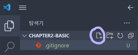 01 .gitignore ํ์ผ์ chapter2-basic ํ๋ก์ ํธ์ ์ต์์ ๊ฒฝ๋ก์ ์์ฑํ๋ค. ๋ค์์ VSCode์์ ์์ฑํ๋ ๊ทธ๋ฆผ์ด๋ค. ์ํ๋ ๋ฐฉ์์ผ๋ก ์์ฑํ๋ฉด ๋๋ค.
