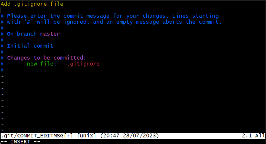 02 β iλ₯Ό μ λ ₯νλ€. κ·Έλ¬λ©΄ μ λ ₯ λͺ¨λλ‘ μ νλκ³ ν°λ―Έλ λ΄μ© νλ¨ μ²λΌ -- INSERT -- νμκ° λνλλ€. μ΄μ μ§μ μ»€λ° λ©μμ§λ₯Ό μμ±ν μ μλ€λ μλ―Έμ΄λ€.