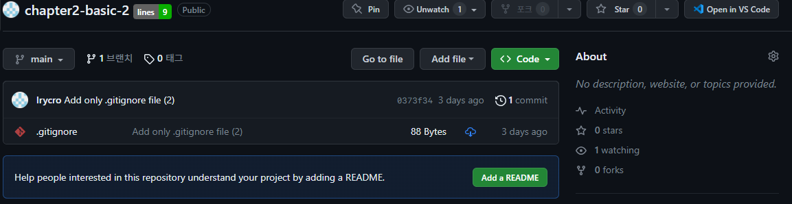 02 νλ‘μ νΈ μ΄λ¦μΈ β [Repository name] νλͺ©μ chapter2-baisc-2λΌκ³ λ£κ³ → λλ¨Έμ§ νλͺ©μ κΈ°λ³Έκ°μΌλ‘ μ μ§ν μ± → β‘ [Create repository] λ²νΌμ λλ¬ μ μ₯μλ₯Ό μμ±νλ€.